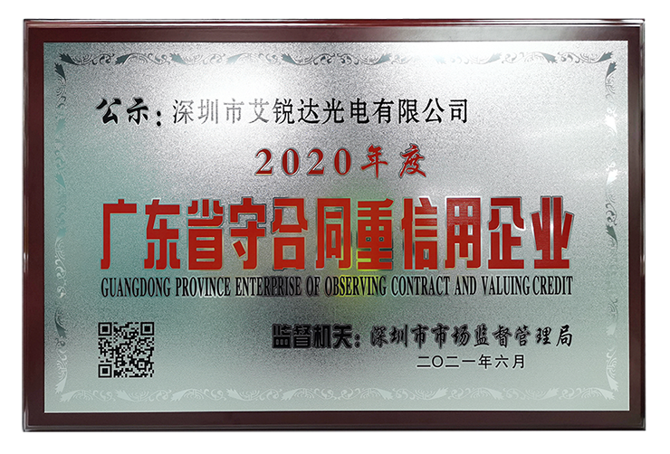 近日,深圳市市场监督管理局公布2021年度“广东省守合同重信用企业”名单,凭借着诚信守法的商业信誉、严谨规范的合同管理体系以及良好的市场口碑,深圳市艾锐达光电有限公司荣获“广东省守合同重信用企业”荣誉称号。